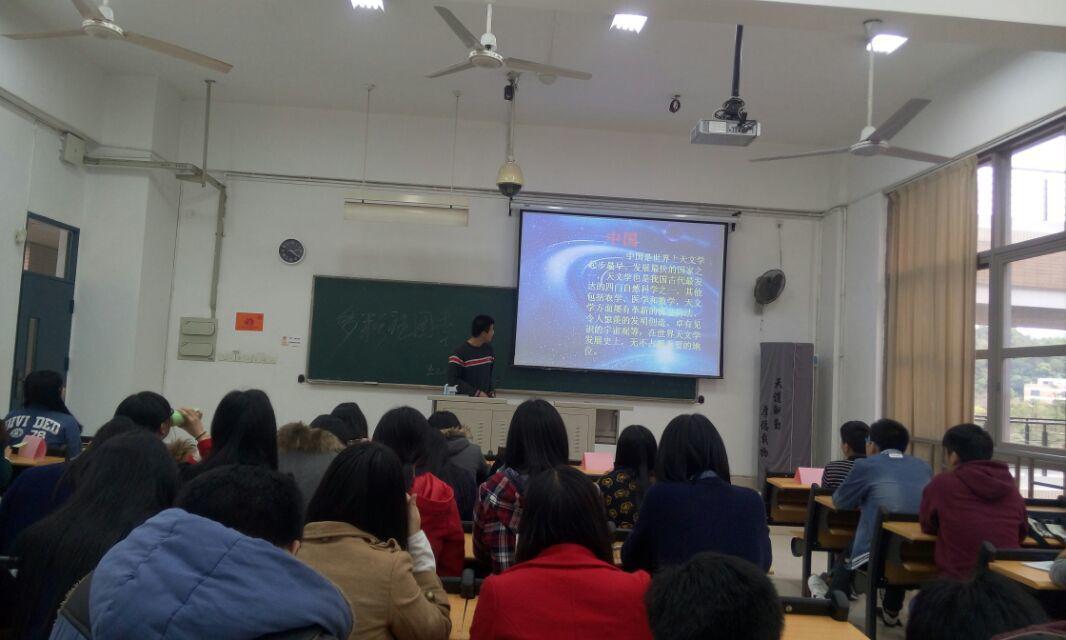 3月24日,13级4班团支部邀请到了我校天文学会会长为同学们介绍基础天文学知识,并带来天文望远镜、指星笔、星图等天文器材教大家使用。当日晚上,天文社成员在图书馆门前的空地上进行望远镜的现场教学和试用,分辨星座。