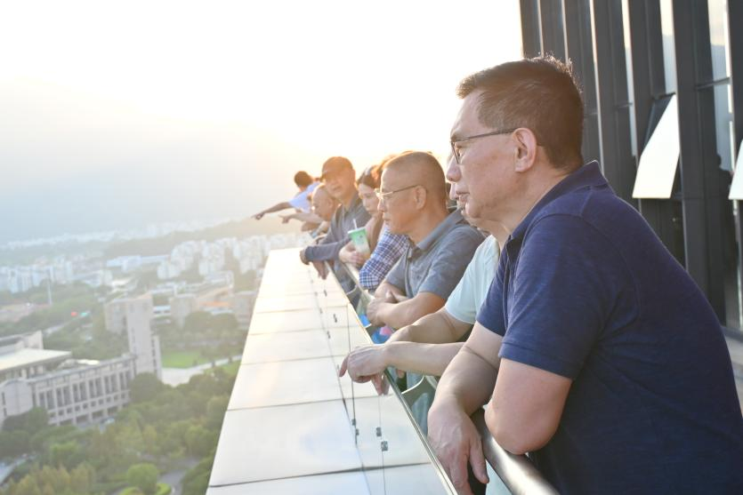离开校史馆,校友们来到晋江楼观景台。在晋江楼观景台上,福州大学旗山校区的全景如画卷般徐徐展开,校友们纷纷赞叹近年来母校的卓越变化并深情追忆40多年前在我校求学的青春时光。