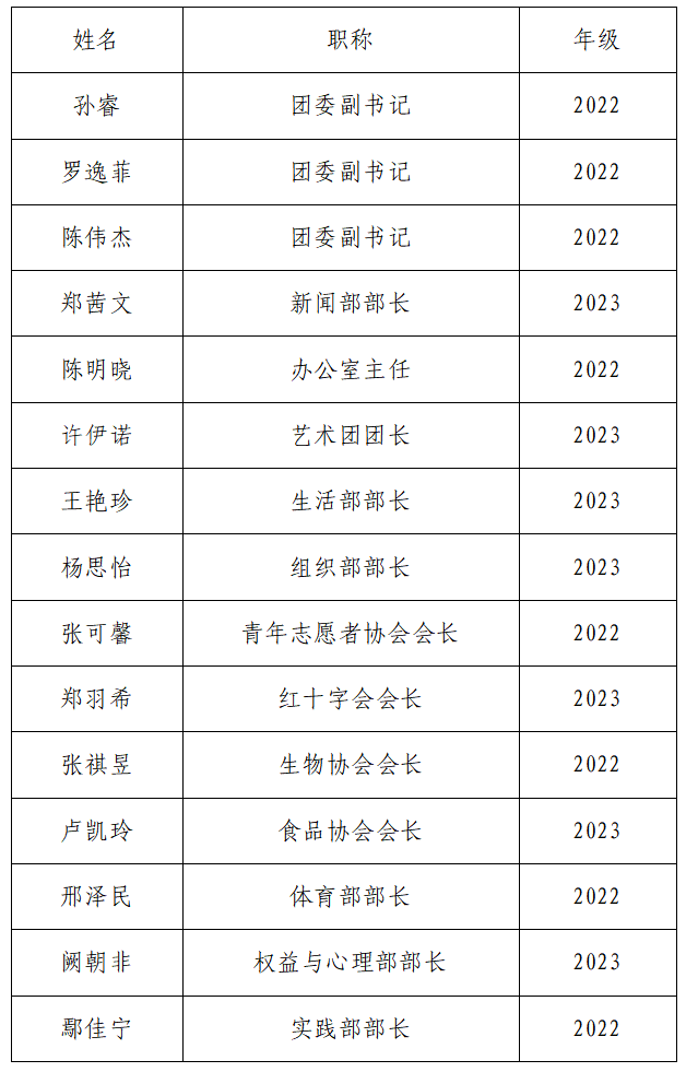 金沙集团1862cc成色2023届学生团委副书记、各部门部长任期已结束,现根据《金沙集团1862cc成色学生团委副书记选举办法》《金沙集团1862cc成色团委、学生会部门负责人选举办法》等相关文件的规定,由个人报名选举,经团委审核,院党委审批后,最终确定金沙集团1862cc成色2024届学生团委副书记、各部门部长,现将名单公示如下: